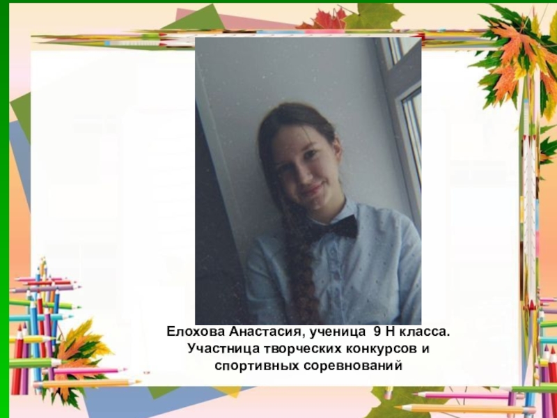 Слайд 22Елохова Анастасия, ученица 9 Н класса. Участница творческих конкурсов и