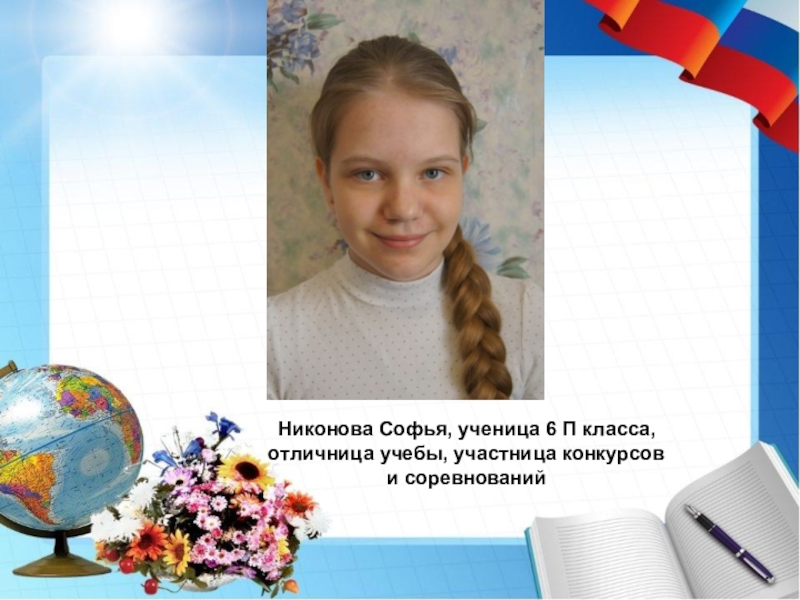 Слайд 38Никонова Софья, ученица 6 П класса, отличница учебы, участница конкурсов