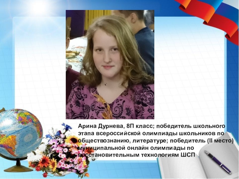 Слайд 35Арина Дурнева, 8П класс; победитель школьного этапа всероссийской олимпиады школьников