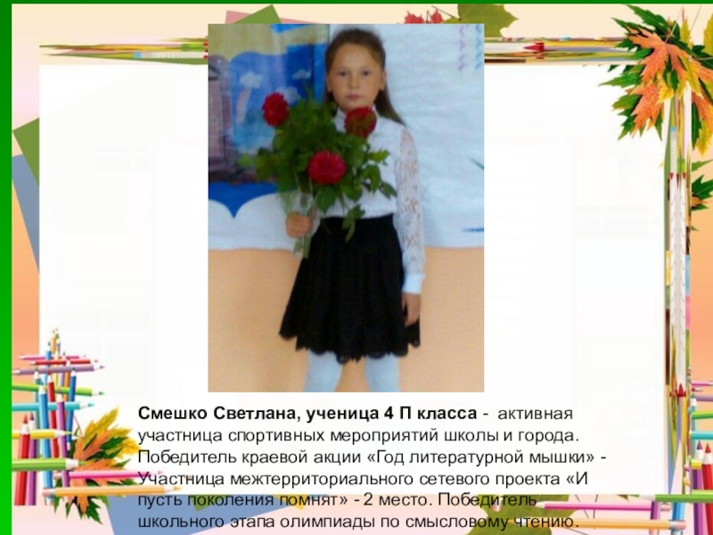 Слайд 27Смешко Светлана, ученица 4 П класса - активная участница спортивных
