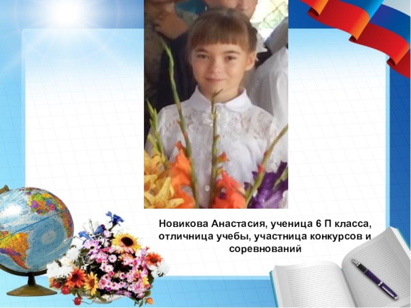 Слайд 39Новикова Анастасия, ученица 6 П класса, отличница учебы, участница конкурсов
