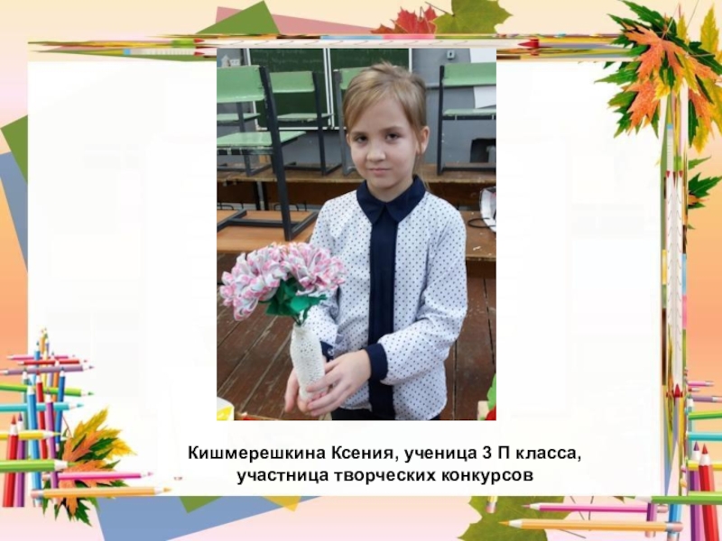 Слайд 29Кишмерешкина Ксения, ученица 3 П класса, участница творческих конкурсов