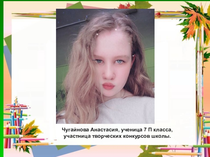 Слайд 23Чугайнова Анастасия, ученица 7 П класса, участница творческих конкурсов школы.