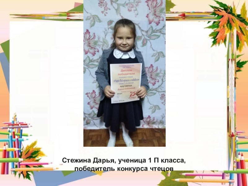Слайд 33Стежина Дарья, ученица 1 П класса, победитель конкурса чтецов