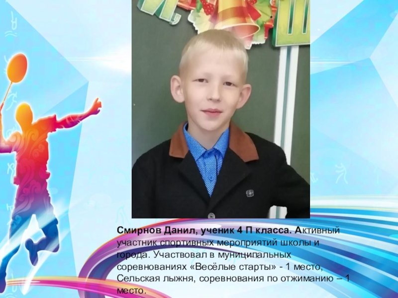 Слайд 14Смирнов Данил, ученик 4 П класса. Активный участник спортивных мероприятий