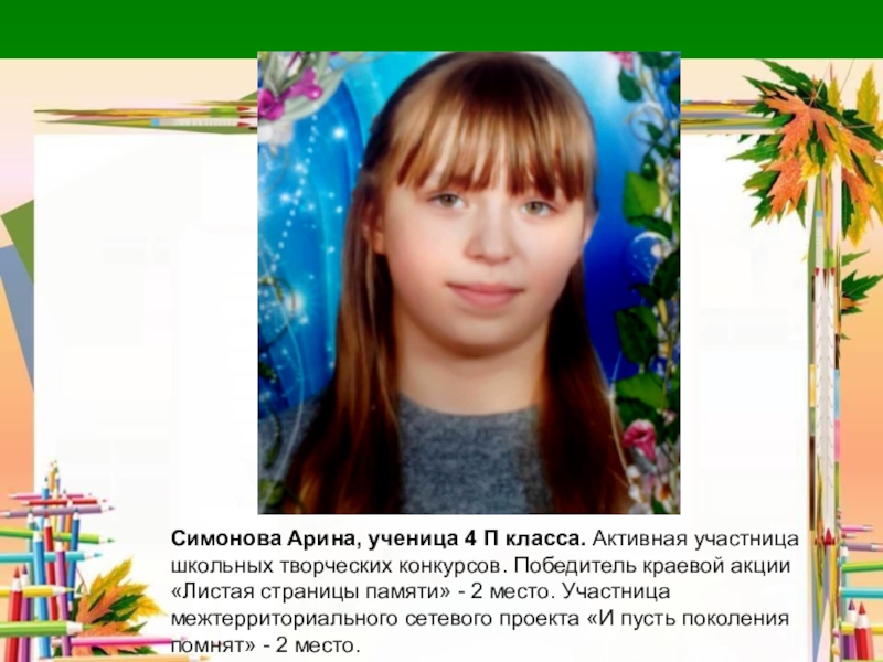 Симонова Арина, ученица 4 П класса. Активная участница школьных творческих конкурсов. Победитель краевой акции «Листая страницы памяти»
