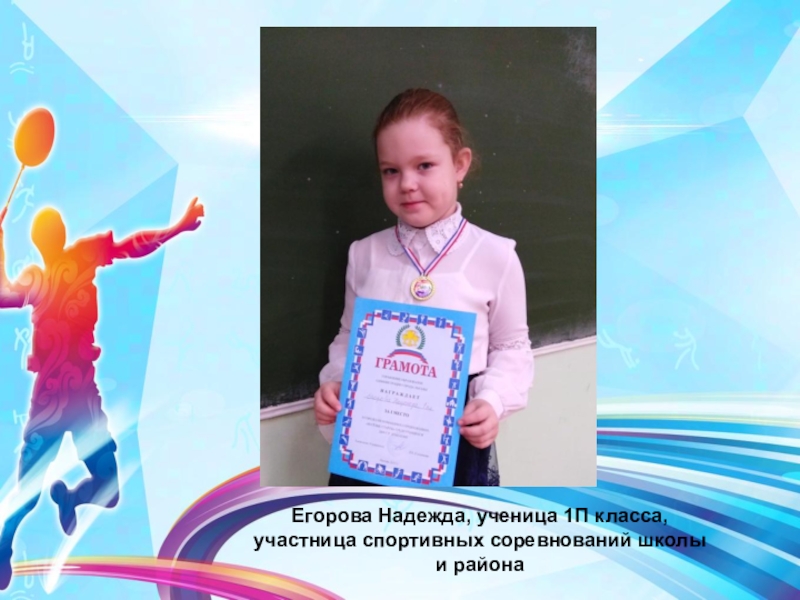 Слайд 17Егорова Надежда, ученица 1П класса, участница спортивных соревнований школы и