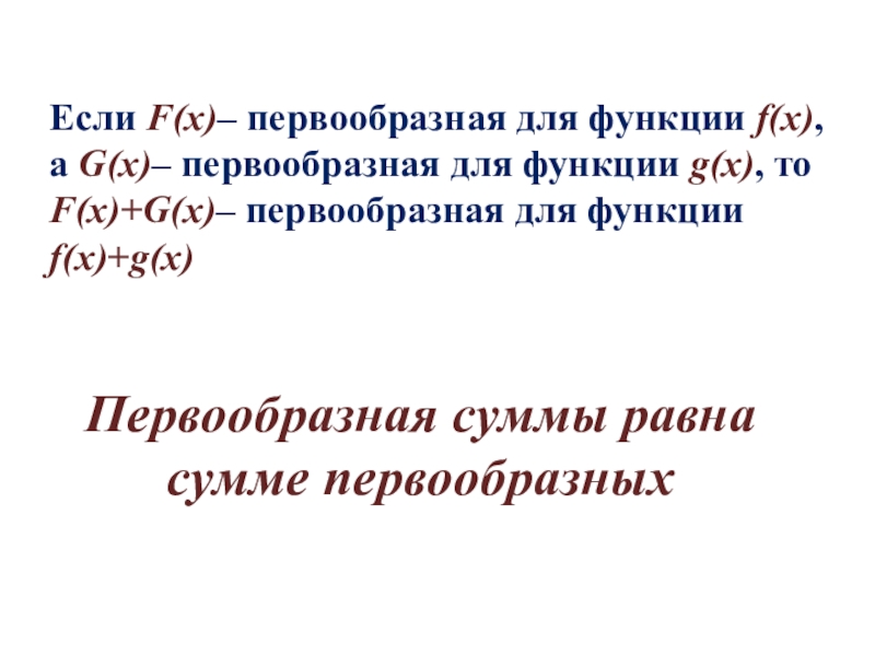 Если F(x)– первообразная для функции f(x), а G(x)– первообразная для функции g(x), то F(x)+G(x)– первообразная для функции