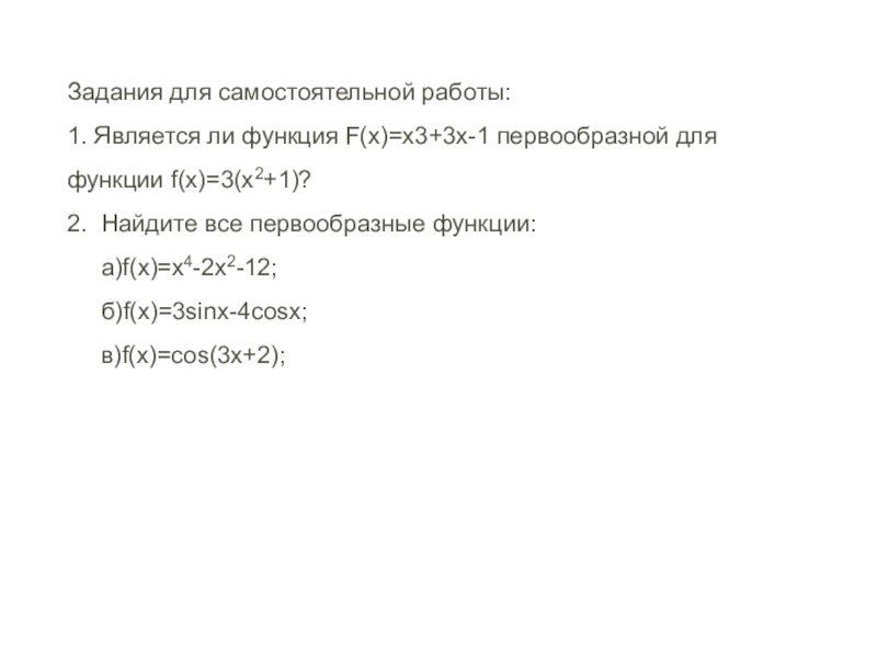 Задания для самостоятельной работы:1. Является ли функция F(x)=x3+3x-1 первообразной для функции f(x)=3(x2+1)?2. Найдите все первообразные функции: