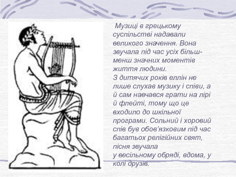 Слайд 9 Музиці в грецькому суспільстві надавали великого значення. Вона звучала