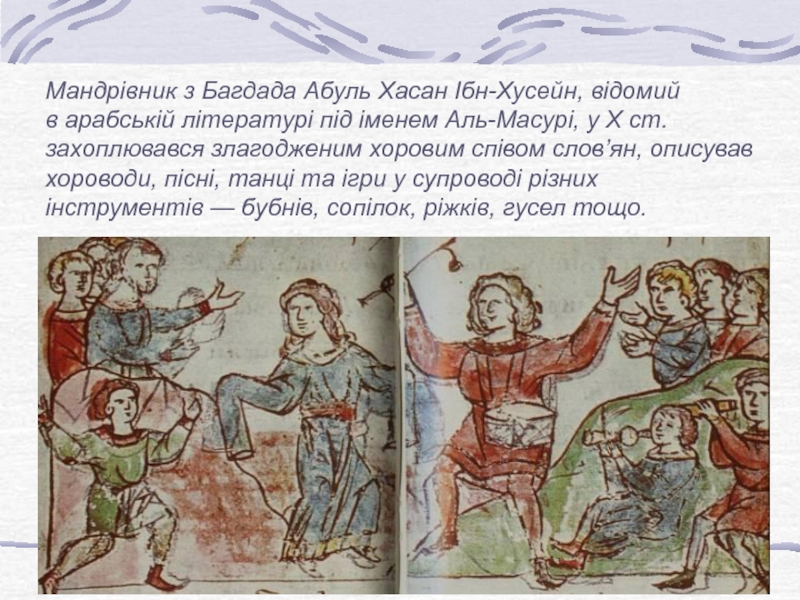 слов’ян, описував хороводи, пісні, танці та ігри у супроводі різних інструментів — бубнів, сопілок, ріжків, гусел тощо.