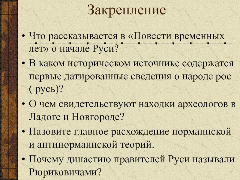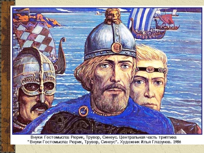 дали им дани, и начали сами собой владеть, и не было среди них правды, и встал род на род, и была у них усобица, и стали воевать друг с другом. И сказали себе: «Поищем себе князя, который бы владел нами и судил по праву». И пошли за море к варягам, к руси. Те варяги назывались русью, как другие назывались шведы, а иные норманны и англы, а ещё иные готландцы,-вот так и эти прозывались. Сказали руси чудь, словене, кривичи и весь: «Земля наша велика и обильна, а порядка в ней нет. Приходите княжить и владеть нами». И избрались трое братьев со своими родами, и взяли с собой всю русь, и пришли, и сел старший Рюрик, в Новгороде, а другой , Синеус,- на Белоозере, а третий, Трувор, -в Изборске. И от тех варягов прозвалась Русская земля.