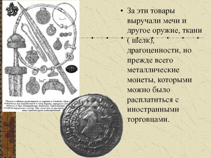 Слайд 19За эти товары выручали мечи и другое оружие, ткани