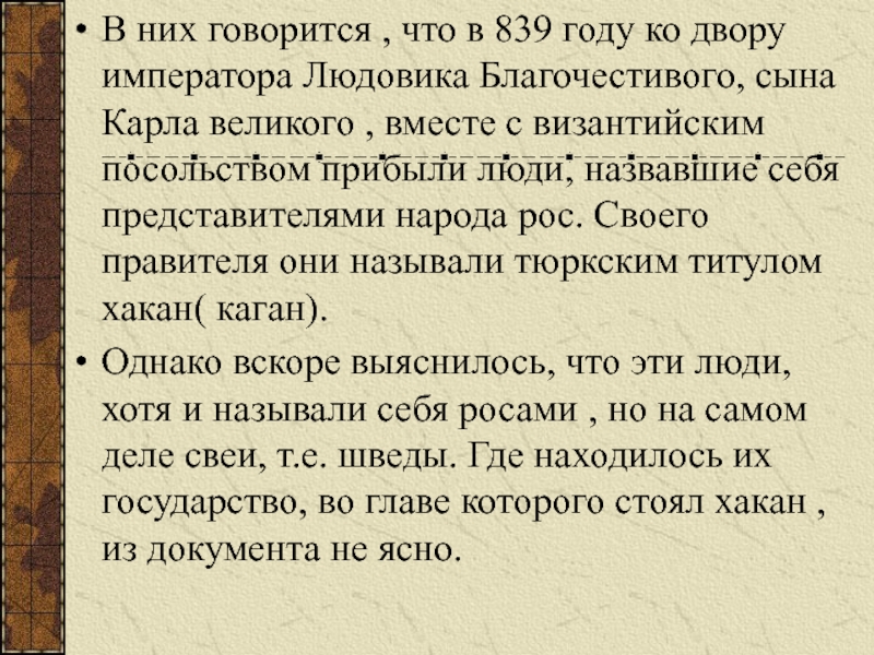 посольством прибыли люди, назвавшие себя представителями народа рос. Своего правителя они называли тюркским титулом хакан( каган).