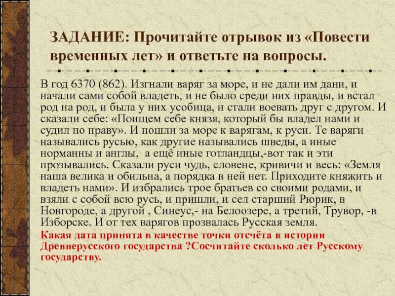 Слайд 6ЗАДАНИЕ: Прочитайте отрывок из «Повести временных лет» и ответьте на