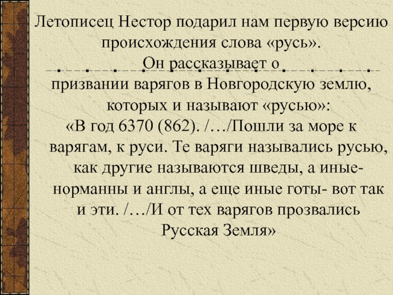 год 6370 (862). /…/Пошли за море к варягам, к руси. Те варяги назывались русью, как другие называются шведы, а иные- норманны и англы, а еще иные готы- вот так и эти. /…/И от тех варягов прозвались Русская Земля»