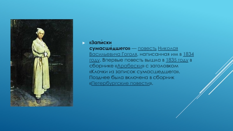 Слайд 5«Запи́ски сумасше́дшего» — повесть Николая Васильевича Гоголя, написанная им в 1834 году. Впервые повесть