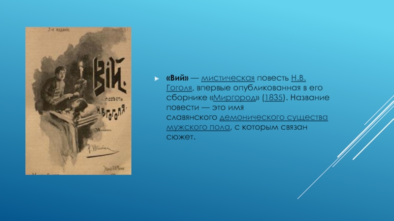 Слайд 4«Вий» — мистическая повесть Н.В. Гоголя, впервые опубликованная в его сборнике «Миргород» (1835). Название