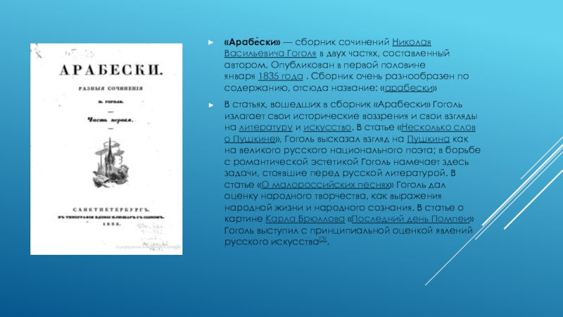 Слайд 3«Арабе́ски» — сборник сочинений Николая Васильевича Гоголя в двух частях, составленный автором. Опубликован