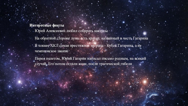 Интересные фактыЮрий Алексеевич любил собирать кактусыНа обратной стороне луны есть кратер, названный в честь ГагаринаВ хоккее ХКЛ