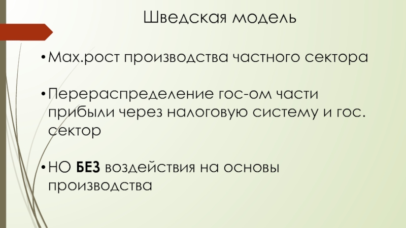 Шведская модельMax.рост производства частного сектораПерераспределение гос-ом части прибыли через налоговую систему и гос.секторНО БЕЗ воздействия на основы