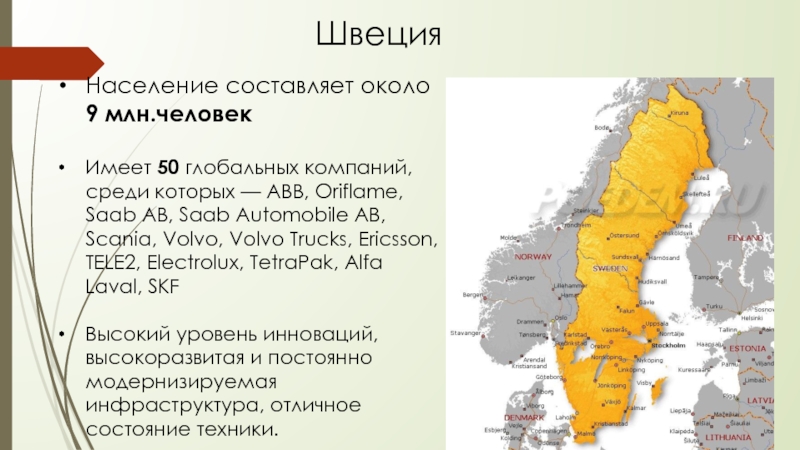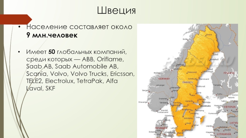 ШвецияНаселение составляет около 9 млн.человек Имеет 50 глобальных компаний, среди которых — ABB, Oriflame, Saab AB, Saab Automobile AB, Scania, Volvo, Volvo Trucks, Ericsson, TELE2, Electrolux, TetraPak, Alfa Laval, SKF