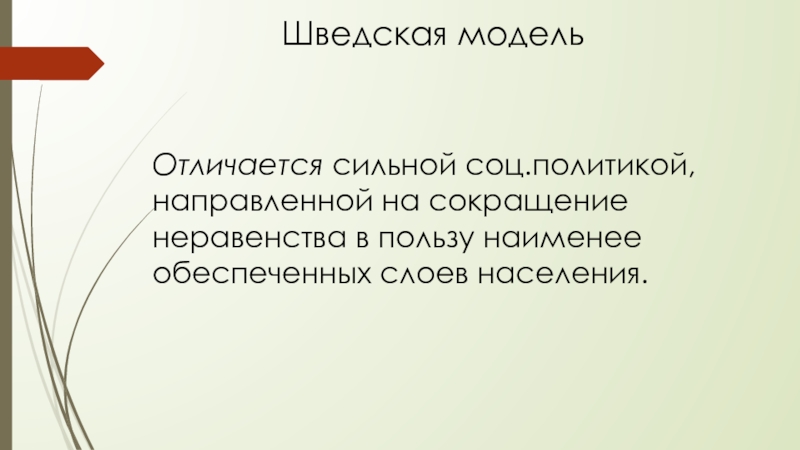 Шведская модельОтличается сильной соц.политикой, направленной на сокращение неравенства в пользу наименее обеспеченных слоев населения.