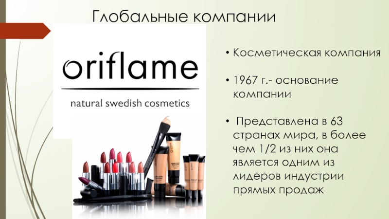 Глобальные компанииКосметическая компания1967 г.- основание компании Представлена в 63 странах мира, в более чем 1/2 из них