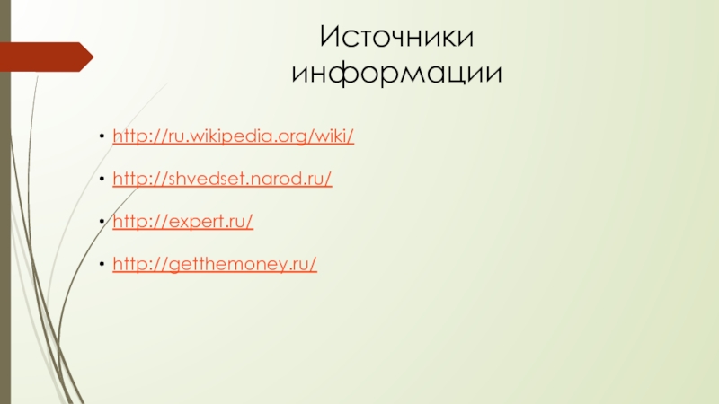 Источники информацииhttp://ru.wikipedia.org/wiki/http://shvedset.narod.ru/http://expert.ru/http://getthemoney.ru/