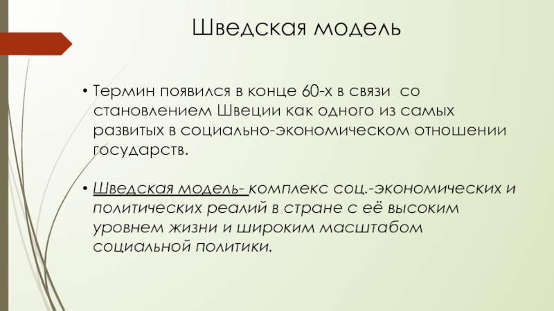 Шведская модельТермин появился в конце 60-х в связи со становлением Швеции как одного из самых развитых в