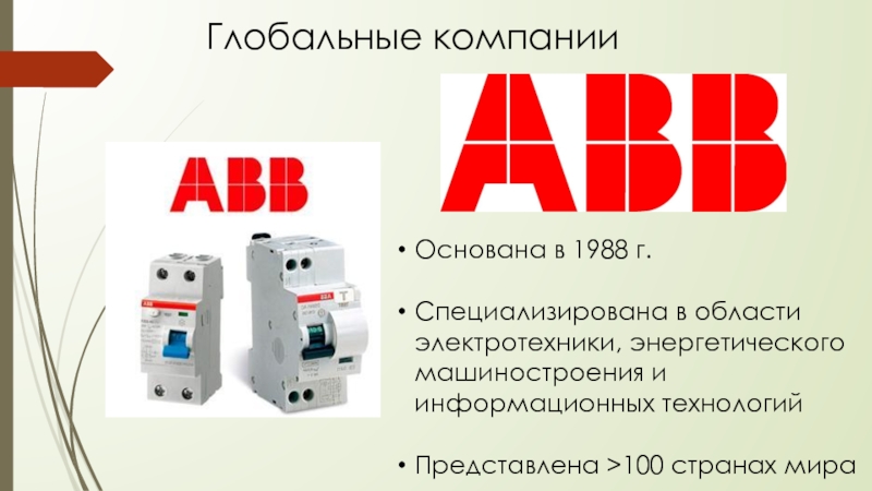 Глобальные компанииОснована в 1988 г.Специализирована в области электротехники, энергетического машиностроения и информационных технологийПредставлена >100 странах мира