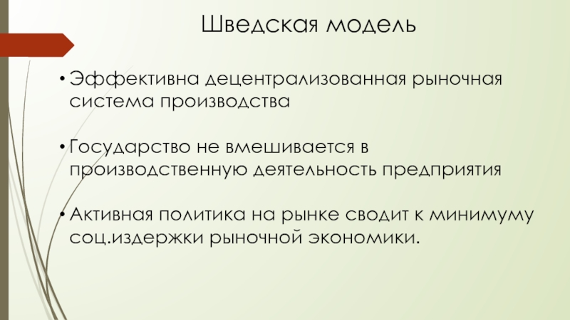 Шведская модельЭффективна децентрализованная рыночная система производстваГосударство не вмешивается в производственную деятельность предприятияАктивная политика на рынке сводит к