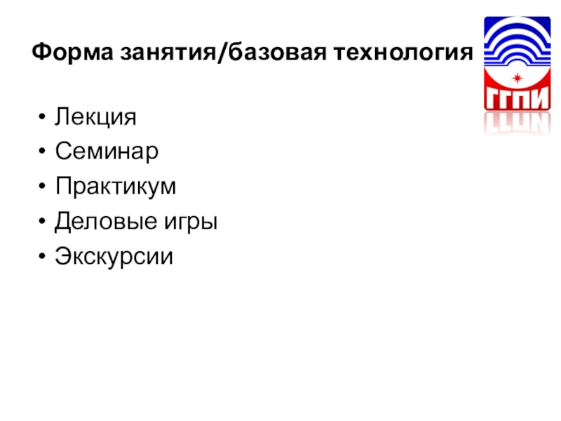 Форма занятия/базовая технологияЛекцияСеминарПрактикумДеловые игрыЭкскурсии