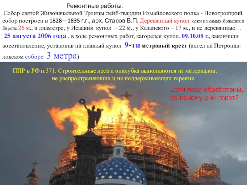 Собор святой Живоначальной Троицы лейб-гвардии Измайловского полка - Новотроицкий собор построен в 1828—1835 г.г., арх. Стасов В.П. Деревянный купол один из самых больших в Европе 26 м., в диаметре, у Исаакия купол – 22 м., у Казанского – 17 м., и не деревянные…
