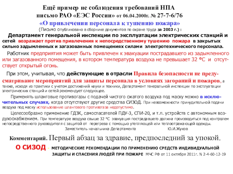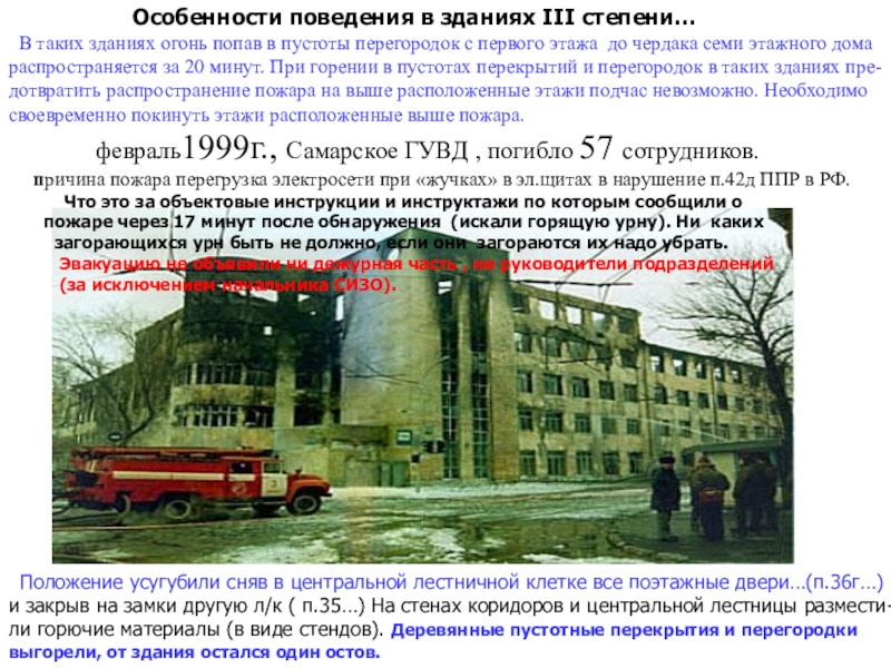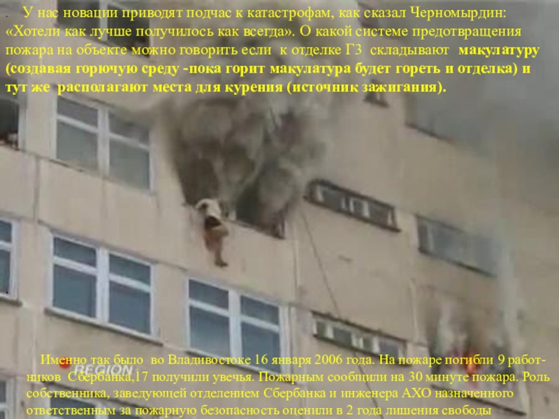 Именно так было во Владивостоке 16 января 2006 года. На пожаре погибли 9 работ-ников Сбербанка,17 получили увечья. Пожарным сообщили на 30 минуте пожара. Роль собственника, заведующей отделением Сбербанка и инженера АХО назначенного ответственным за пожарную безопасность оценили в 2 года лишения свободы