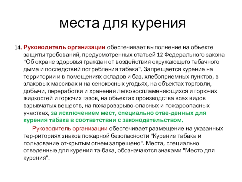 граждан от воздействия окружающего табачного дыма и последствий потребления табака". Запрещается курение на территории и в помещениях складов и баз, хлебоприемных пунктов, в злаковых массивах и на сенокосных угодьях, на объектах торговли, добычи, переработки и хранения легковоспламеняющихся и горючих жидкостей и горючих газов, на объектах производства всех видов взрывчатых веществ, на пожаровзрыво-опасных и пожароопасных участках, за исключением мест, специально отве-денных для курения табака в соответствии с законодательством.