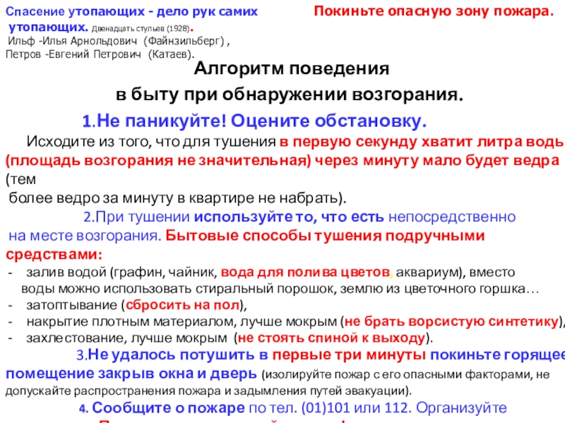 вместе, нельзя ни кого оставлять так, как приток кислорода воздуха активи-зирует горение и приводит подчас к детонации пожара (хлопок как при взрыве). Из 100 полезших в огонь за родственниками 95 погибают вместе с ними.