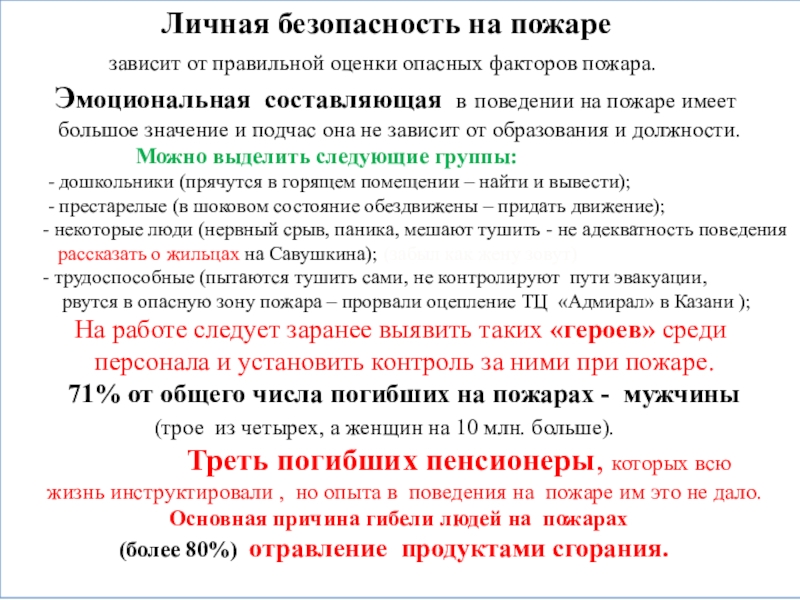 - трудоспособные (пытаются тушить сами, не контролируют пути эвакуации,