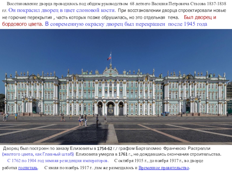Восстановление дворца проводилось под общим руководством 68 летнего Василия Петровича Стасова 1837-1838 г.г. Он покрасил дворец в цвет слоновой кости. При восстановлении дворца спроектировали новые не горючие перекрытия , часть которых позже обрушилась, но это отдельная тема. Был дворец и бордового цвета. В современную окраску дворец был перекрашен после 1945 года