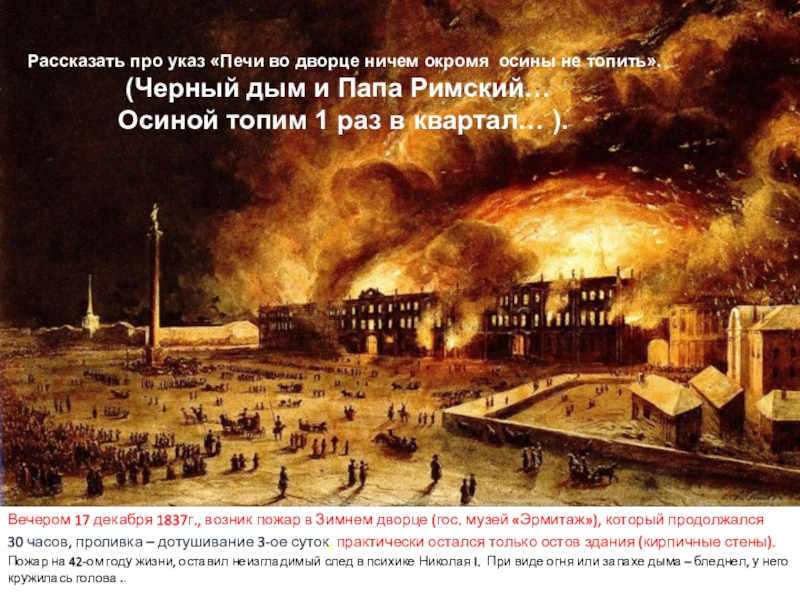 Слайд 34Вечером 17 декабря 1837г., возник пожар в Зимнем дворце (гос.