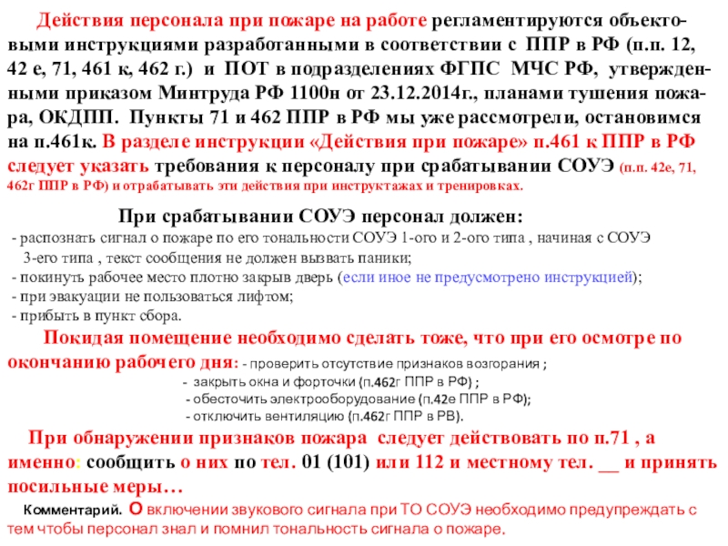 п.71.При обнаружении пожара или признаков горения в здании, помещении (задымление, запах гари, повышение температуры воздуха и др.) необходимо: