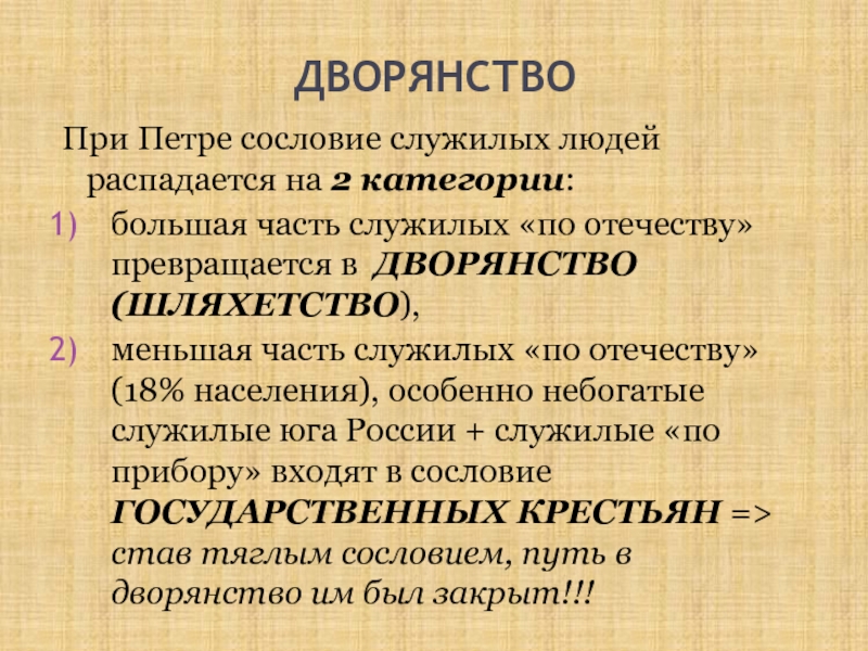 При Петре сословие служилых людей распадается на 2 категории: