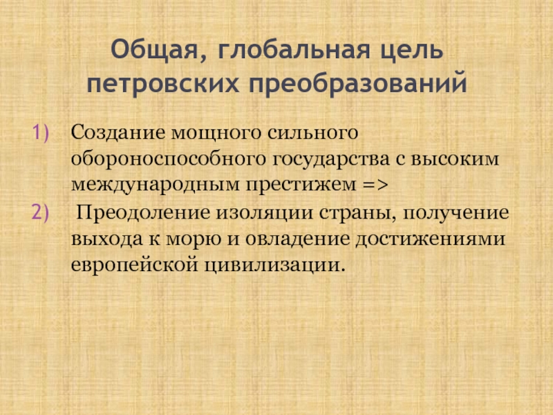 Слайд 16Общая, глобальная цель петровских преобразований