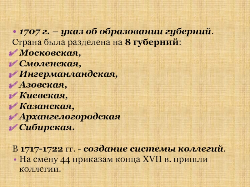 На смену 44 приказам конца XVII в. пришли коллегии.