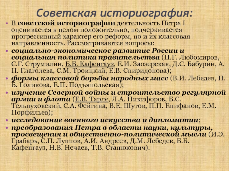 В советской историографии деятельность Петра I оценивается в целом