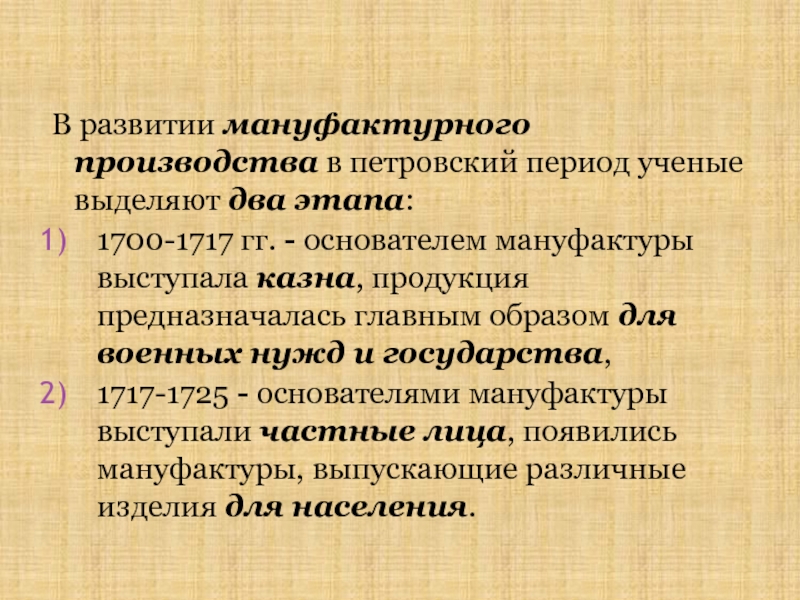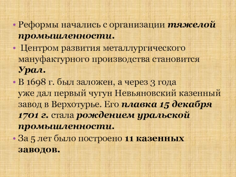 нравственной оценки методов преобразований. Кроме того, в отличие от Грозного – Петр действительно карал реальных противников. Крепостнические порядки были изобретены не Петром, а его отцом Алексеем Михайловичем. Другое дело – он закрепостил новые категории населения. Но альтернативы не было! Колоссальная роль государства - особенность России, поэтому нельзя упрекать Петра в насаждении гос. промышленности и крепостных мануфактур. В стране нет рынка вольнонаемного труда крепостная мануфактура никакой другой не могла быть. Взгляд на Петра апологетический, нет места парадоксам, противоречиям, историческим параллелям.