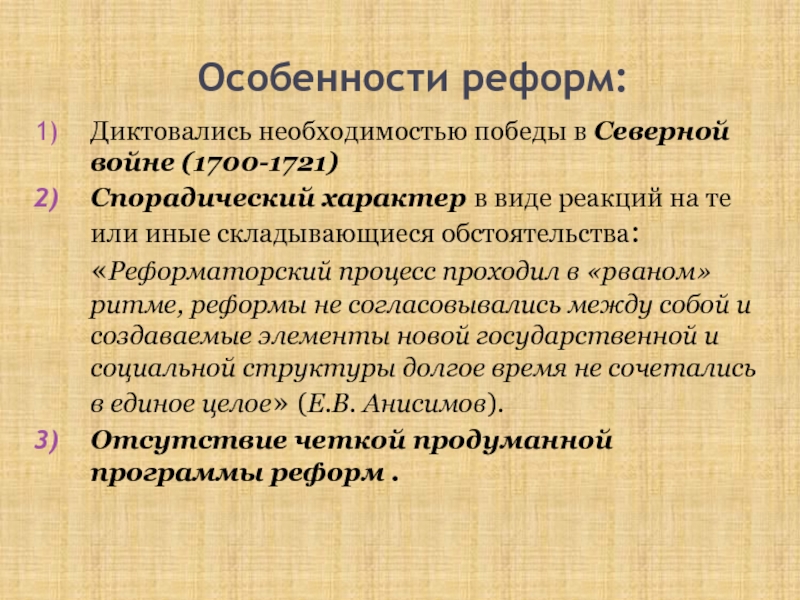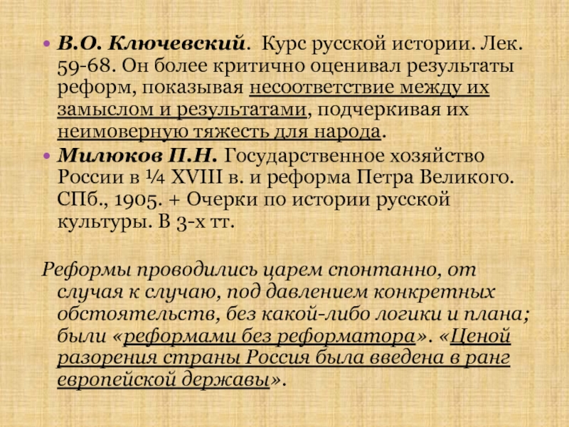 Реформы проводились царем спонтанно, от случая к случаю, под давлением конкретных обстоятельств, без какой-либо логики и плана; были «реформами без реформатора». «Ценой разорения страны Россия была введена в ранг европейской державы».