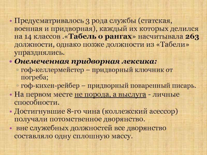 Слайд 49Предусматривалось 3 рода службы (статская, военная и придворная), каждый их