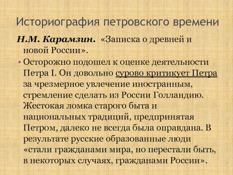 Петра за чрезмерное увлечение иностранным, стремление сделать из России Голландию. Жестокая ломка старого быта и национальных традиций, предпринятая Петром, далеко не всегда была оправдана. В результате русские образованные люди «стали гражданами мира, но перестали быть, в некоторых случаях, гражданами России».