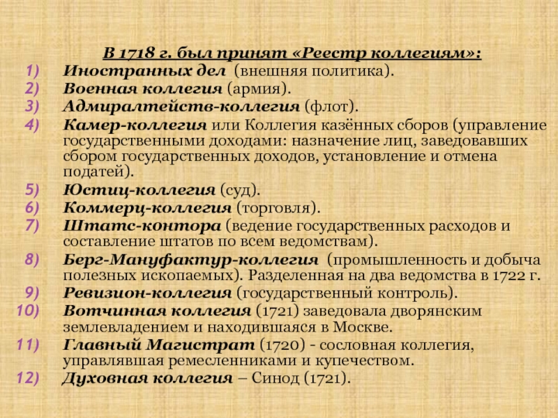В 1718 г. был принят «Реестр коллегиям»: